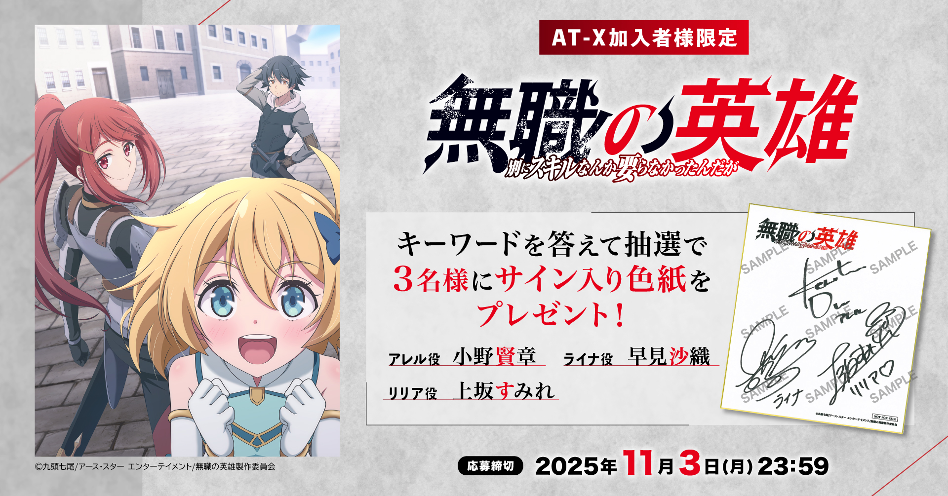 【応募締切:11月3日(月)】AT-X加入者様限定!「無職の英雄 ~別にスキルなんか要らなかったんだが~」サイン入り色紙を3名様にプレゼント! に応募するにはAT-Xメンバーズクラブへのログインが必要です。
